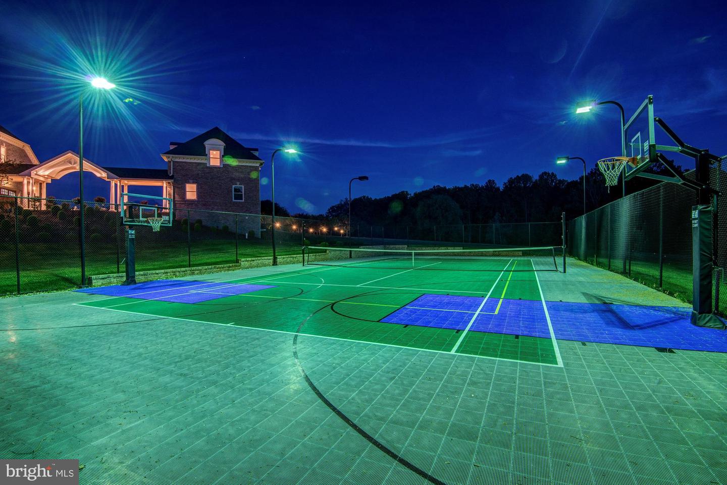 Multi-purpose court accommodates tennis, basketball, or pickleball. Regulation size with professional surface and lighting for evening play.